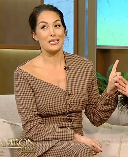 on Tamron Hall Show on ABC was spotted wearing this gingham check top and pants on Tamron Hall Show on Jan 26 2023's episode. 's Top is the Plaid Off-The-Shoulder Top by A.W.A.K.E. MODE . 's Pants is the Layered checked tweed flared pants by A.W.A.K.E. MODE.