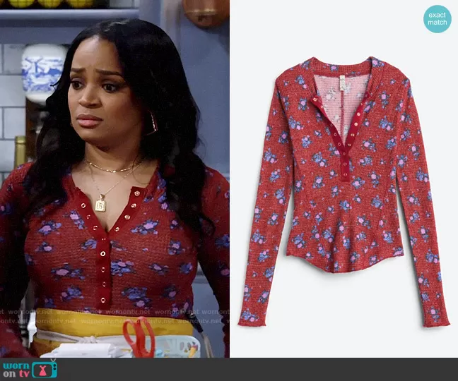 Randi (played by Kyla Pratt) on Call Me Kat on Fox was spotted wearing this burgundy floral henley top on Call Me Kat on episode 'Call Me Ichabod Evel Knievel' (3x12) in Jan 2023. Randi's Top is the Printed One Of The Girls Henley by Free People.