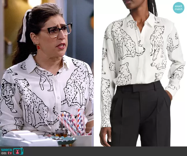 Kat Silver (played by Mayim Bialik) on Call Me Kat on Fox was spotted wearing this white big cats print button down top on Call Me Kat on episode 'Call Me Ichabod Evel Knievel' (3x12) in Jan 2023. Kat's Top is the Kathryn Shirt in Ivory Wild Cats by Rails.