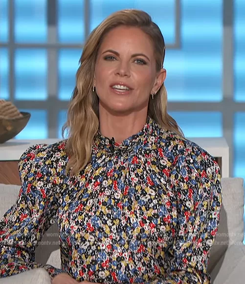 Natalie Morales on The Talk on CBS was spotted wearing this floral print high neck blouse on The Talk on Jan 26 2023's episode. Natalie's Top is the Mena Top by Veronica Beard.
