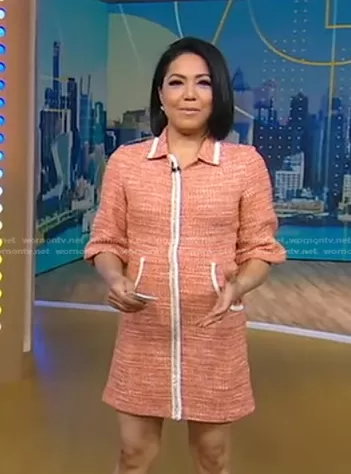 Stephanie Ramos on Good Morning America on ABC was spotted wearing this orange tweed mini dress on Good Morning America on Jan 27 2023's episode. Stephanie's Dress is the Rimoda Three-Quarter Sleeve Dress by Maje.