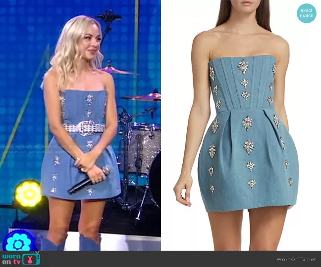 on Good Morning America on ABC was spotted wearing this embellished denim corset dress on Good Morning America on Jan 30 2023's episode. 's Dress is the Maraya Denim Diamond Mini Dress by Bronx and Banco . 's Belt is the Glass Rhinestone Belt by Wonderwest.