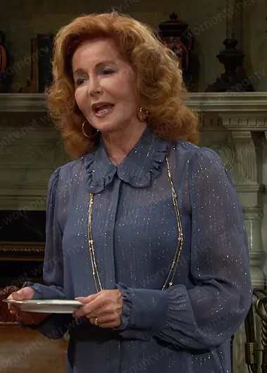 Maggie Horton (played by Suzanne Rogers) on Days of our Lives on Peacock was spotted wearing this metallic striped blouse on Days of our Lives on Jan 31 2023's episode. Maggie's Top is the Metallic Stripe Ruffle Collar Shirt by 7 For All Mankind.