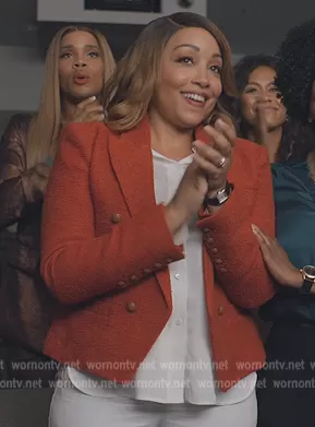 (played by ) on All American Homecoming on CWTV was spotted wearing this Orange tweed blazer on All American Homecoming on episode 'Rock the Boat' (2x08) in Jan 2023. 's Blazer is the Kenzie Tweed Balzer by L'Agence.