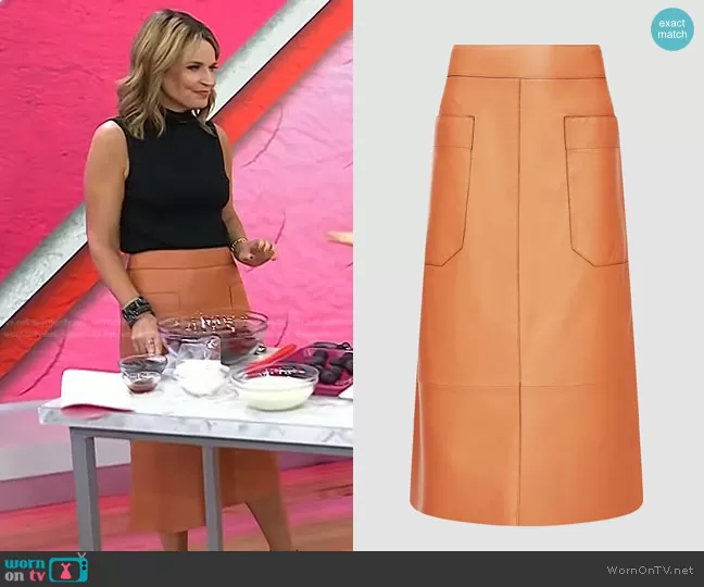 Savannah Guthrie on Today on NBC was spotted wearing this orange leather skirt on Today on Jan 31 2023's episode. Savannah's Skirt is the Blomfield Paneled Leather Midi Skirt by Joseph.