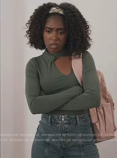 (played by Heather Lynn Harris) on All American Homecoming on CWTV was spotted wearing this Gabrielle green cutout top on All American Homecoming on episode 'Hard Place' (2x09) in Jan 2023. 's Bodysuit is the Long-Sleeve Mesh Cutout Bodysuit by Abercrombie and Fitch . 's Pants is the TRF Seamed Straight Jeans by Zara.