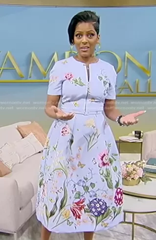 Tamron Hall on Tamron Hall Show on ABC was spotted wearing this light blue floral zip dress on on Tamron Hall Show on Jan 31 2023's episode. Tamron's Dress is the Floral Faille Zip Midi-Dress by Oscar de la Renta.
