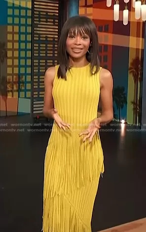 Zuri Hall on Access Hollywood on NBC was spotted wearing this yellow ribbed fringed dress on Access Hollywood on Jan 31 2023's episode. Zuri's Dress is the Spiral Dress by Simon Miller.