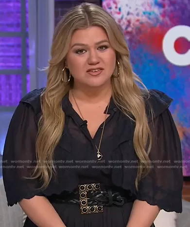 Kelly Clarkson on The Kelly Clarkson Show on NBC was spotted wearing this black studded buckle belt on The Kelly Clarkson Show on Jan 31 2023's episode. Kelly's Belt is the Interwoven Leather Buckle Belt by Etro.