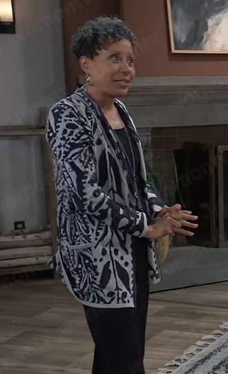 Stella Henry (played by Vernee Watson) on General Hospital on ABC was spotted wearing this grey printed cardigan on General Hospital on Jan 31 2023's episode. Stella's Sweater is the Here & There Cardigan by Nic + Zoe .
