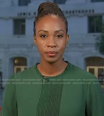 on Today on NBC was spotted wearing this green pintuck top on Today on Aug 15 2023's episode. 's Top is the Pintucked Smocked Cuff Chiffon Top in Alpine Green by Cece.