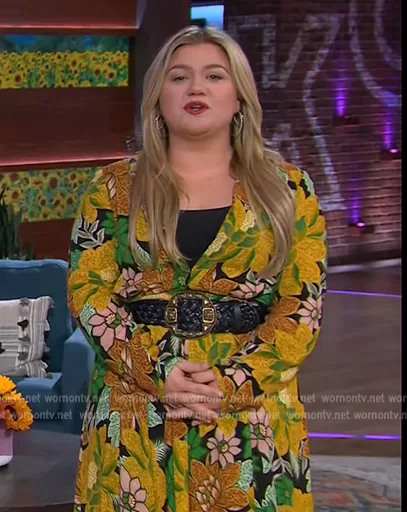 Kelly Clarkson on The Kelly Clarkson Show on NBC was spotted wearing this yellow floral print maxi dress on The Kelly Clarkson Show on Feb 01 2023's episode. Kelly's Dress is the Black Garden Long Sleeve Maxi Dress by Farm Rio.