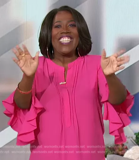 Sheryl Underwood on The Talk on CBS was spotted wearing this pink ruffle sleeve blouse on The Talk on Feb 01 2023's episode. Sheryl's Top is the Ruffle Sleeve Split Neck Blouse by Vince Camuto.