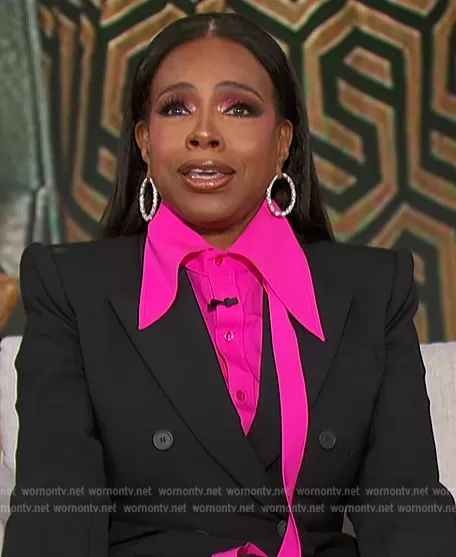 on The Talk on CBS was spotted wearing this neon pink blouse on The Talk on Feb 01 2023's episode. 's Top is the Split Collar Shirt by Christopher John Rogers.