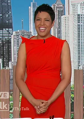 on The Talk on CBS was spotted wearing this red gathered dress on The Talk on Feb 01 2023's episode. 's Dress is the Narciso Rodriguez Ruched Dress by Zara.