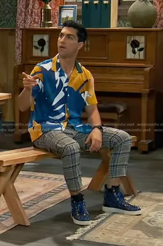 Parker Preston (played by Trevor Tordjman) on Bunkd on Disney was spotted wearing this leaf print shirt and plaid pants on Bunkd on episode 'The Wrath of Con' (6x15) in Feb 2023. Parker's Shirt is the Stretch Shirt with Leaf Print by Zara . Parker's Pants is the Skinny Cargo Check Pants by Topman.