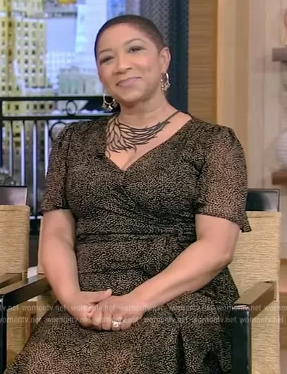 Deja Vu on Live with Kelly and Mark on Disney ABC Home Entertainment was spotted wearing this black spotted wrap dress on Live with Kelly and Ryan on Sep 18 2024's episode. Deja Vu's Dress is the Printed Flutter-Sleeve Midi Dress by DKNY.