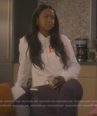 Annika (played by Justine Skye) on Grown-ish on Freeform was spotted wearing this white Moschino print hoodie on Grown-ish on episode 'Big Drip' (5x12) in Feb 2023. Annika's Sweater is the Rainbow Logo Hoodie by Moschino.
