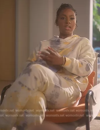 Annika (played by Justine Skye) on Grown-ish on Freeform was spotted wearing this tie dye print hoodie and sweatpants on Grown-ish on episode 'Big Drip' (5x12) in Feb 2023. Annika's Sweater is the Seasonal Classics acid wash fleece hoodie in cream by Nike . Annika's Pants is the Seasonal Classics acid wash casual fit cuffed fleece sweatpants by Nike.