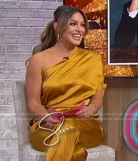 on Sherri on FOX was spotted wearing this gold satin one shoulder top and pants on Sherri on Feb 03 2023's episode. 's Top is the One Shoulder Tie Top by The Sei . 's Pants is the Wide Leg Trouser by The Sei.