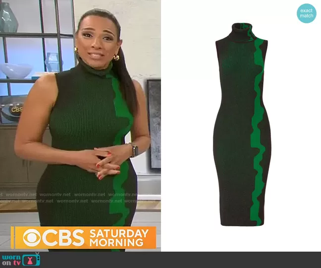 Michelle Miller on CBS Mornings on CBS was spotted wearing this green printed sleeveless turtleneck dress on CBS Mornings on Feb 05 2023's episode. Michelle's Dress is the Lowri Sheath Dress by Solace London .