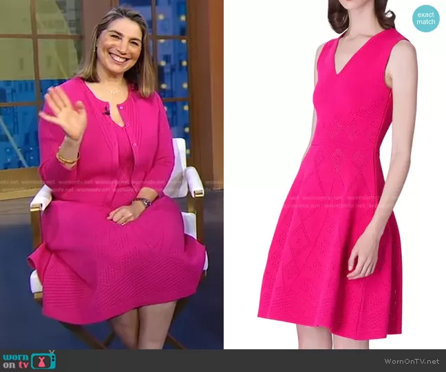 on Good Morning America on ABC was spotted wearing this pink knit dress and pointelle cardigan on Good Morning America on Feb 06 2023's episode. 's Dress is the Pointelle Jacquard Fit & Flare Dress by Carolina Herrera . 's Sweater is the Pointelle Cardigan by Carolina Herrera.