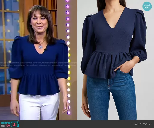 Ginger Zee on Good Morning America on ABC was spotted wearing this navy peplum top on Good Morning America on Feb 06 2023's episode. Ginger's Top is the Puff Sleeve Peplum Top by Express.