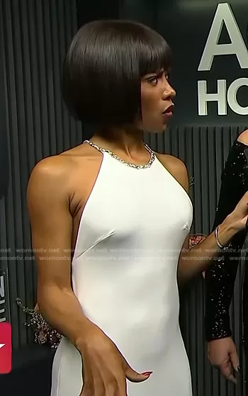 Zuri Hall on Access Hollywood on NBC was spotted wearing this white embellished halter dress on Access Hollywood on Feb 06 2023's episode. Zuri's Dress is the Halter Gown with Crystal Trim by Nicole by NF.