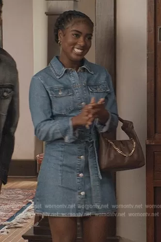 (played by Heather Lynn Harris) on All American Homecoming on CWTV was spotted wearing this denim mini dress on All American Homecoming on episode 'Dance With My Father' (2x10) in Feb 2023. 's Dress is the Denim Mini Dress by Zara.