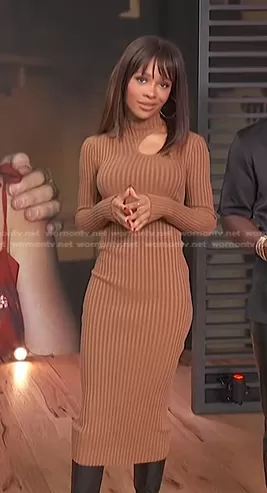 Zuri Hall on Access Hollywood on NBC was spotted wearing this brown ribbed cutout dress on Access Hollywood on Feb 07 2023's episode. Zuri's Dress is the Victoria Cut-Out Midi Dress by Anine Bing.
