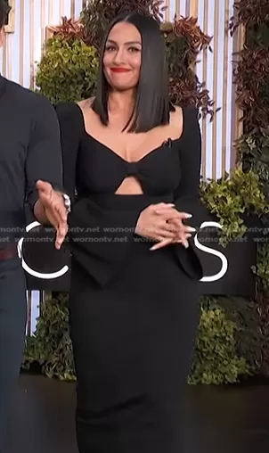 on Access Hollywood on NBC was spotted wearing this black cutout dress on Access Hollywood on Feb 07 2023's episode. 's Dress is the Cutout Ribbed-Knit Midi Dress by Self Portrait.