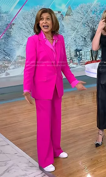 Hoda Kotb on Today on NBC was spotted wearing this pink shirt and blazer on Today on Feb 08 2023's episode. Hoda's Top is the Kinsley Stretch Silk Blouse by A.L.C. . Hoda's Jacket is the One Button Cinched Boyfriend Blazer in Neon Berry by Express . Hoda's Pants is the Editor Mid Rise Relaxed Trouser Pant in Neon Berry by Express . Hoda's Shoes is the PU Leather Casual Shoes by Adokoo at Amazon.