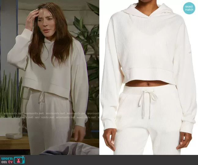 Taylor Hayes (played by Krista Allen) on The Bold and the Beautiful on CBS was spotted wearing this ivory knit hoodie and pants set on The Bold and the Beautiful on Feb 08 2023's episode. Taylor (old)'s Sweater is the Muse Hoodie in Ivory by Alo Yoga . Taylor (old)'s Pants is the Muse Sweatpants in Ivory by Alo Yoga.