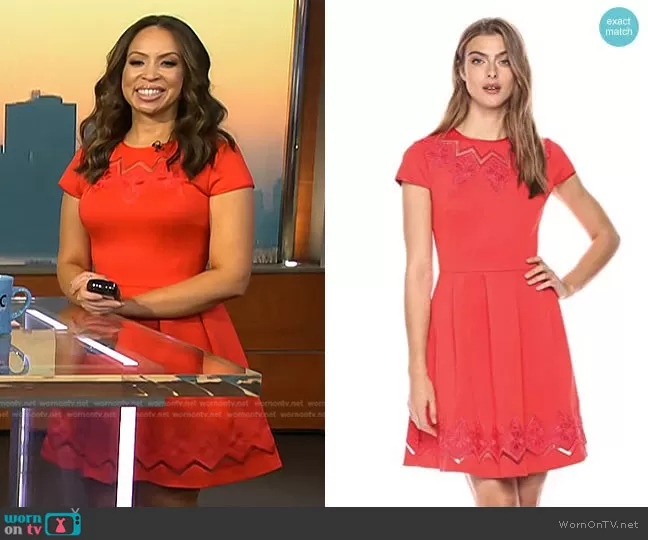 Adelle Caballero on Today on NBC was spotted wearing this red mesh detail skater dress on Today on Jul 18 2025's episode. Adelle's Dress is the Cheskka Lace and Mesh Skater Dress by Ted Baker.