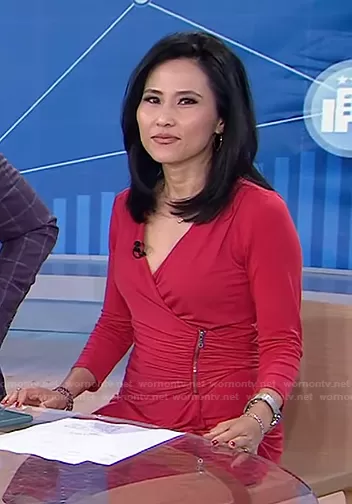 Vicky Nguyen on Today on NBC was spotted wearing this red zip waist wrap dress on Today on Nov 08 2021's episode. Vicky's Dress is the Zip-Waist Jersey Dress in Bright Red by Max & Cleo.