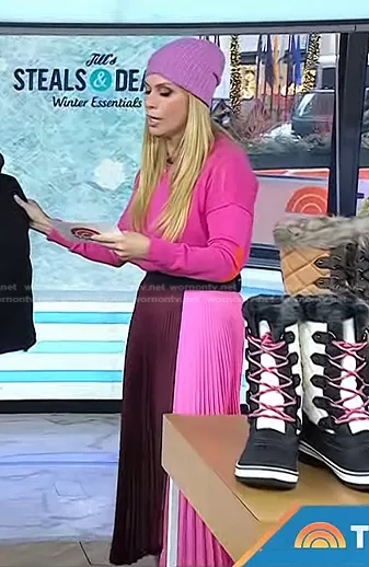 Jill Martin on Today on NBC was spotted wearing this pink colorblock pleated skirt on Today on Feb 09 2023's episode. Jill's Skirt is the Grainger Asymmetrical Pleated Midi Skirt by A.L.C..