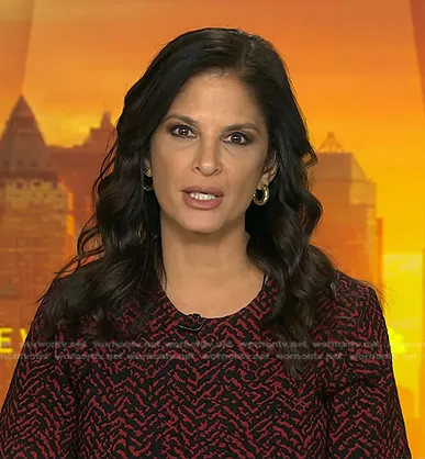 on Today on NBC was spotted wearing this red and black printed dress on Today on Feb 09 2023's episode. 's Dress is the Ruffled High-Low Midi Dress by Calvin Klein.