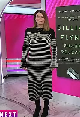 on Today on NBC was spotted wearing this black striped sweater dress on Today on Feb 09 2023's episode. 's Dress is the Boucle Mini Stripe Long Sleeve Sweater Dress by Proenza Schouler.