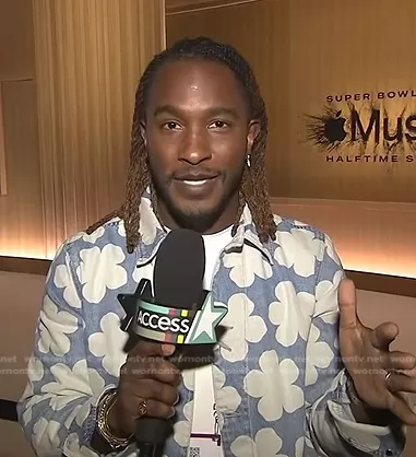 Scott Evans on Access Hollywood on NBC was spotted wearing this blue floral denim jacket on Access Hollywood on Feb 09 2023's episode. Scott's Jacket is the Floral Denim Workwear Jacket by Kenzo.
