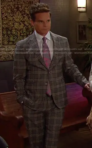 Leo Stark (played by Greg Rikaart) on Days of our Lives on Peacock was spotted wearing this grey grid check blazer on Days of our Lives on Feb 04 2026's episode. Leo's Jacket is the Hanry Windowpane Stretch Wool Sport Coat by Hugo Boss . Leo's Pants is the Perin Plaid Stretch Wool Trousers by Boss.