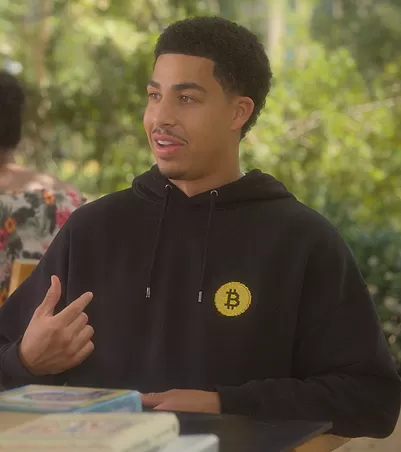 Andre Johnson, Jr. (played by Marcus Scribner) on Grown-ish on Freeform was spotted wearing this black Bitcoin logo hoodie on Grown-ish on episode 'Addiction' (5x13) in Feb 2023.