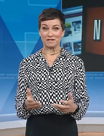 Stephanie Gosk on Today on NBC was spotted wearing this checkered blouse on Today on Sep 03 2024's episode. Stephanie's Top is the Contorted Check Silk Blouse by Elie Tahari.