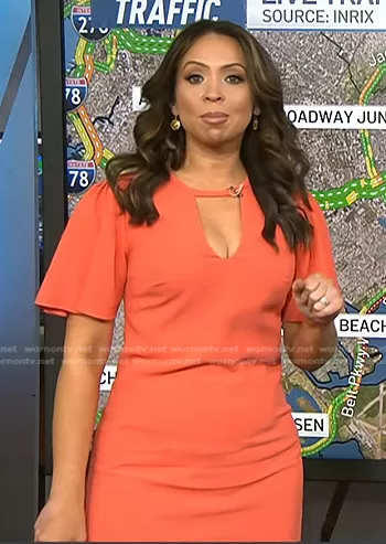 Adelle Caballero on Today on NBC was spotted wearing this orange keyhole dress on Today on Feb 10 2023's episode. Adelle's Dress is the Anderson Short-Sleeve Cutout Mini Dress by Trina Turk.