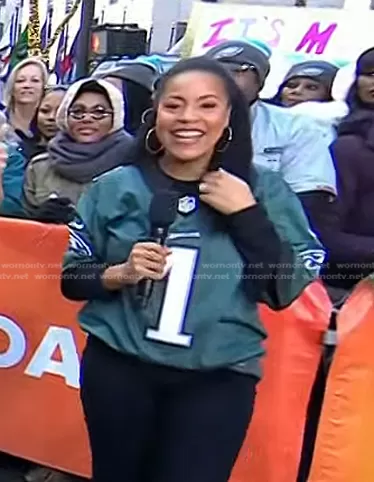 Sheinelle Jones on Today on NBC was spotted wearing this green Philadelphia Eagles jersey on Today on Feb 10 2023's episode. Sheinelle's Top is the Philadelphia Eagles Vapor Limited Stitched Jersey by Nike.