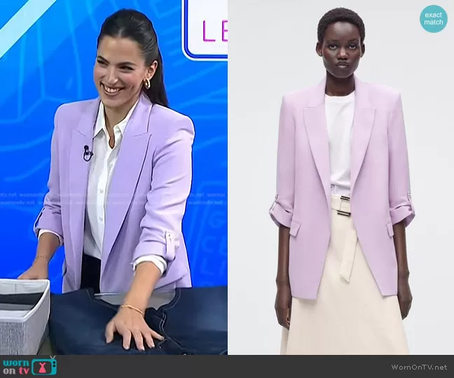 on Today on NBC was spotted wearing this lilac roll-up sleeve jacket on Today on Feb 10 2023's episode. 's Jacket is the Blazer with Rolled-Up Sleeves by Zara.
