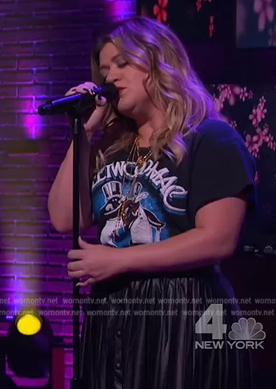 Kelly Clarkson on The Kelly Clarkson Show on NBC was spotted wearing this black Fleetwood Mac tee on The Kelly Clarkson Show on Feb 10 2023's episode. Kelly's Top is the Fleetwood Mac American Tour '77 Tee by Madeworn.