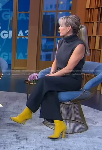 Dr. Jennifer Ashton on Good Morning America on ABC was spotted wearing this grey sleeveless turtleneck and yellow boots on Good Morning America on Feb 10 2023's episode. Jennifer's Shoes is the FFreedom Nubuck Leather Booties by Fendi.