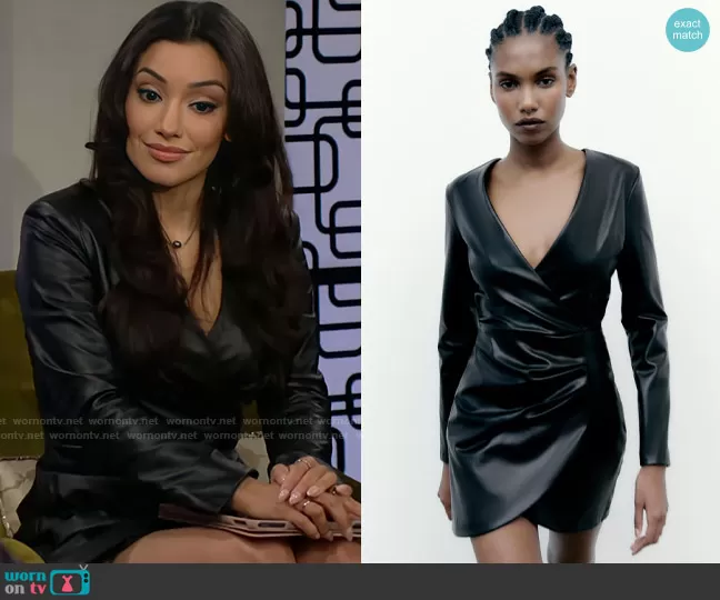 Audra Charles (played by Zuleyka Silver) on The Young and the Restless on CBS was spotted wearing this black leather mini dress on The Young and the Restless on Feb 10 2023's episode. Audra's Dress is the Faux Leather Draped Dress by Zara.