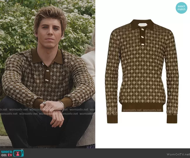 Adam Pratt (played by Lukas Gage) on You on Netflix was spotted wearing this brown printed sweater on You on episode 'Portrait of the Artist' (4x02) in Feb 2023. Adam's Sweater is the Diamond-pattern polo jumper by Namacheko.