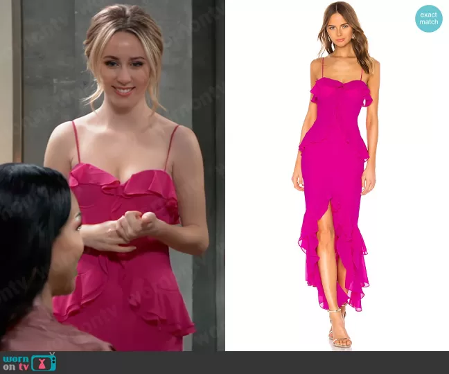 Josslyn Jacks (played by Eden McCoy) on General Hospital on ABC was spotted wearing this pink ruffled dress on General Hospital on Feb 12 2023's episode. Josslyn's Dress is the Melissa Gown in Magenta by Lovers + Friends . Josslyn's Earrings is the Detail Hoop Earring by Amber Sceats.